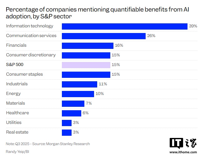 IT之家 11 月 16 日消息,摩根士丹利最新数据显示,标普 500 指数成分股公司中,明确提及人工智能应用带来可量化效益的企业占比持续上升,2025 年第三季度已达 15%,较去年同期的 11% 显著提升。
